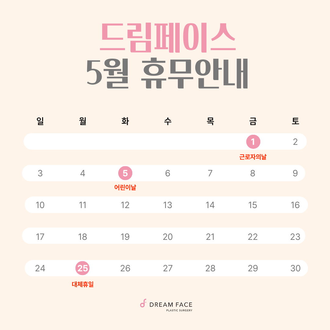 드림페이스 26년 5월 휴무 안내 페이지 정보 작성자드림페이스 댓글0 조회47 작성일26.04.08 16:18 본문 드림페이스의 5월 휴무 일정 안내 드립니다.참고하시어 예약 일정에 착오 없으시길 바랍니다. 감사합니다. 다음글♥ 크리스마스, 26년 새해 첫날 신정은 휴진입니다 ♥ 25.12.06 답글 0 답글목록 답변 대기중입니다.